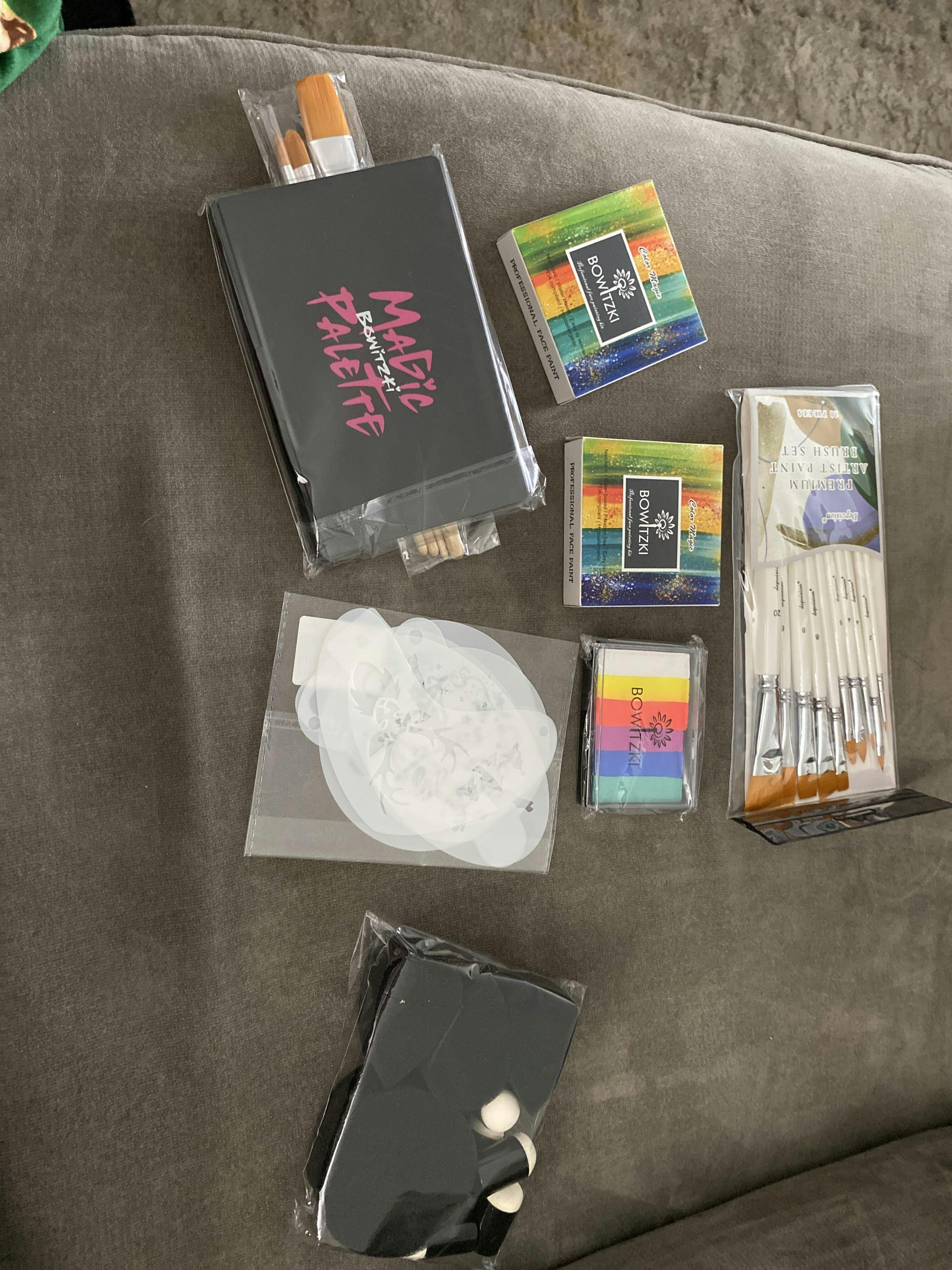 Schablonen, Schwämme, Gesichtsschminkpinsel, Glitzer, Gesichtsjuwelen usw.